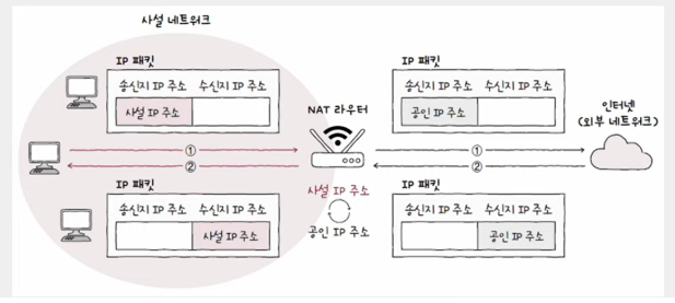 - 사설 네트워크의 패킷 -> 사설 IP 주소는 공유기를 거쳐 공인 IP 주소로 변경