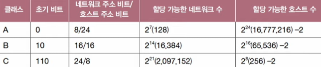 - 가장 처음 옥텟의 주소가 0~127일 경우 A클래스 주소임을 짐작할 수 있음