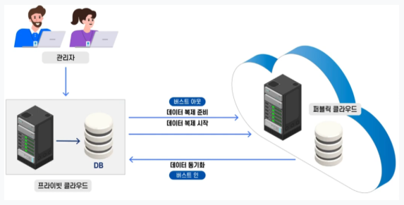 - 기업 내부의 클라우드가 요청 처리량을 감당할 수 없을 때, 일시적으로 퍼블릭 클라우드에 작업을 이관하여 전체 시스템의 처리능력을 향상시키는 기술