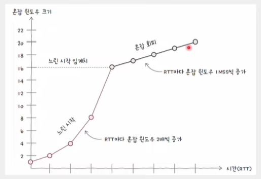 - -> 혼잡 윈도우는 RTT마다 2배씩 지수적으로 증가: 초기 전송 속도 빠른 확보