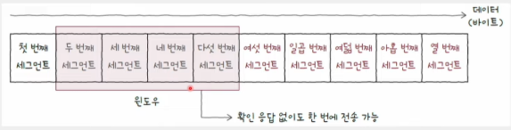 - 윈도우(window) - 송신 호스트가 파이프라이닝할 수 있는 최대량. 즉, 윈도우의 크기만큼 확인 응답을 받지 않고도 한 번에 전송 가능하다는 의미