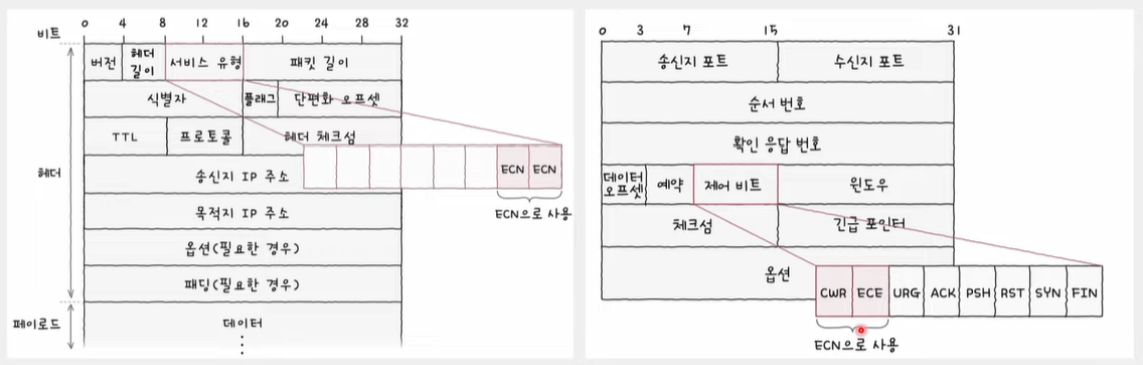 - ECN을 이용하면 수신 호스트의 ACK 세그먼트(라우터의 경고)를 통해 더 빠르게 혼잡을 감지