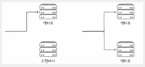 - 한 시스템은 가동하고, 다른 시스템은 백업 용도로 대기 상태(스탠바이)
