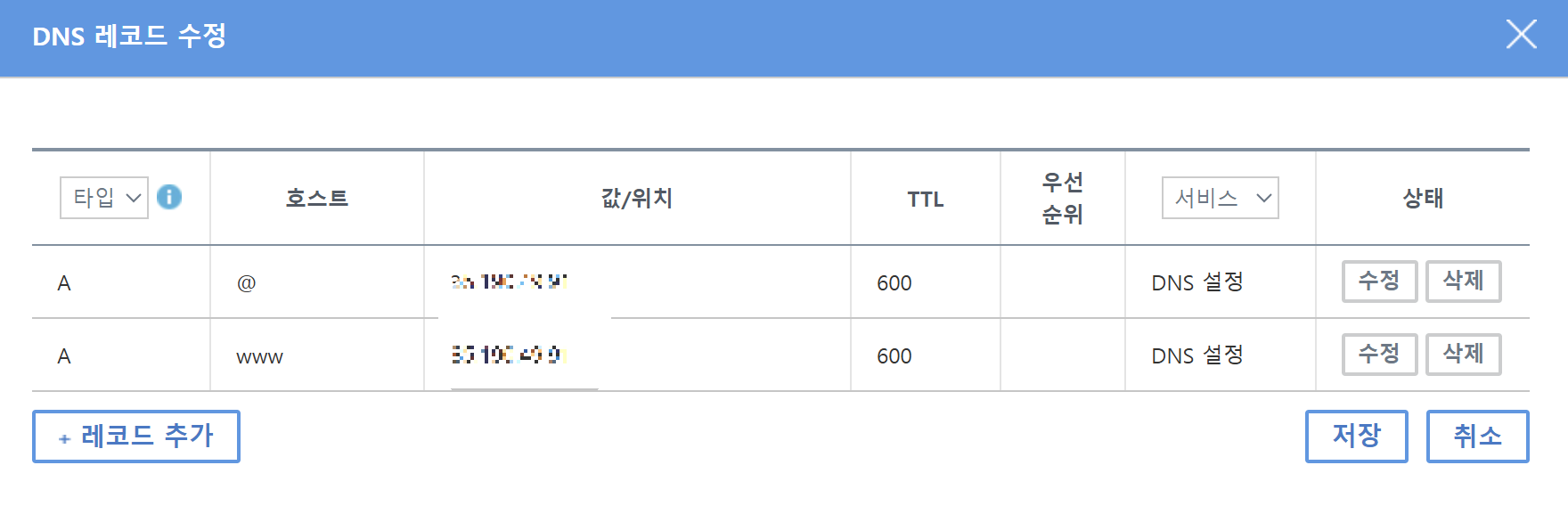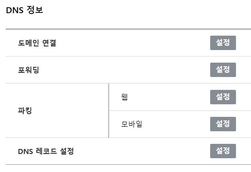 DNS 정보 섹션을 찾아서 DNS 레코드 설정 옆에 설정 버튼을 누른다.