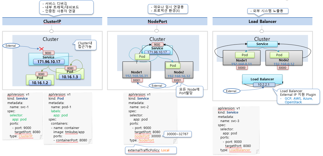 - 접근: [어느 노드의 IP든지]:[지정된 NodePort]로 접속하면, 해당 서비스에 연결된 파드로 트래픽이 전달됩니다.