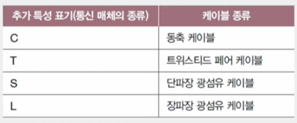 - 숫자 뒤에 G가 붙는 경우 Gbps 속도 (예: 100Base-T 케이블은 100Mbps 속도 지원, 10GBASE-T는 10Gbps 속도 지원)