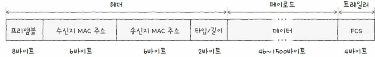 - 헤더 - 프리앰블, 수신지 MAC 주소, 송신지 MAC 주소, 타입/길이